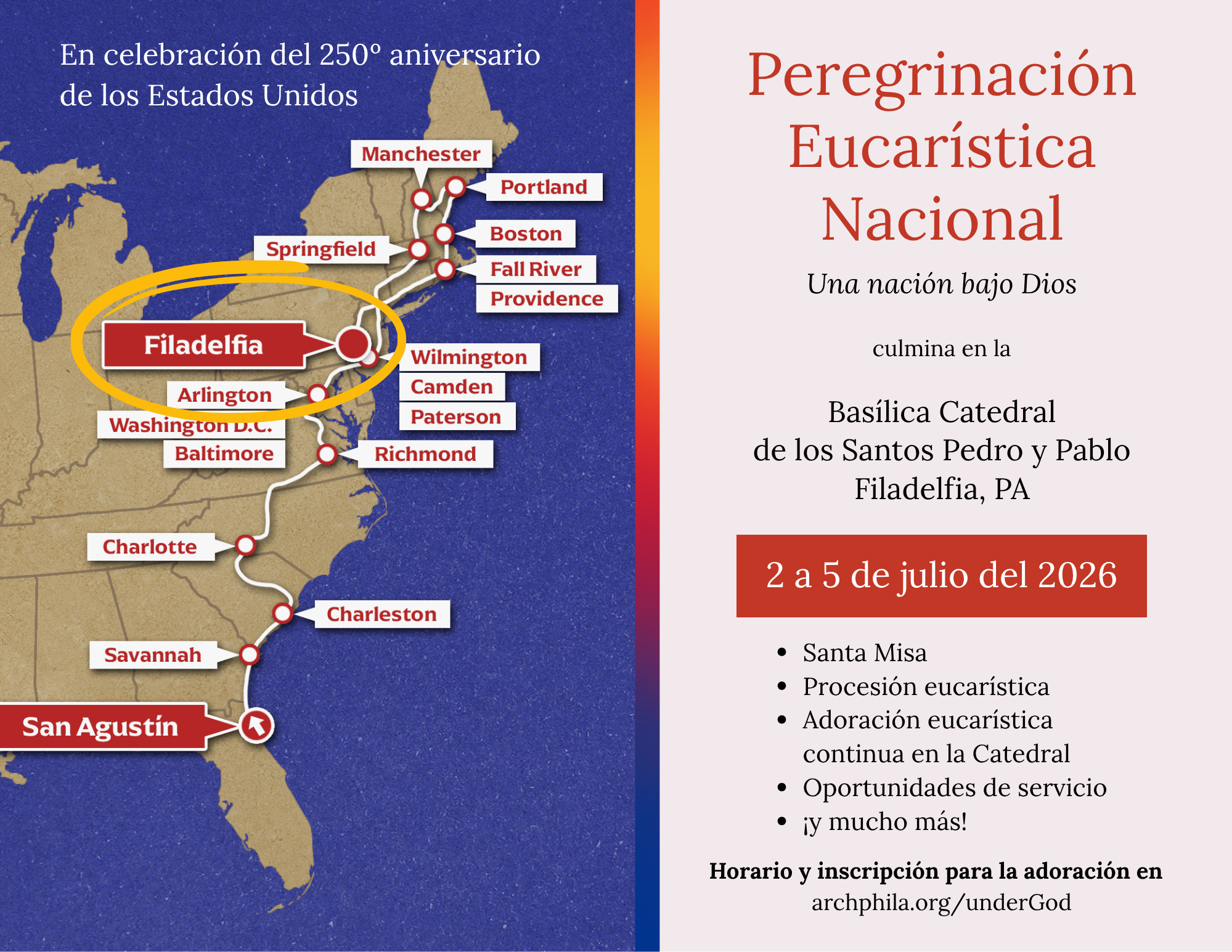 - Despues de la Misa, habrá una Procesión Eucarística hacia la Iglesia de San Pedro (Santuario de San Juan Neumann), situada en la intersección de la 5th Street y Girard Avenue, en Filadelfia, PA.